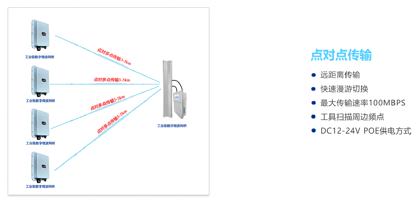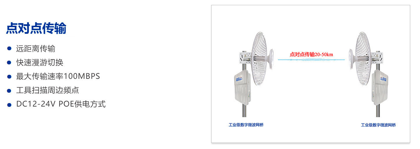 采用802.11aC标准,可根据现场要求配备不同的天线将两个远距离的节点进行有效的网络连接,传输距离可以达到30KM。