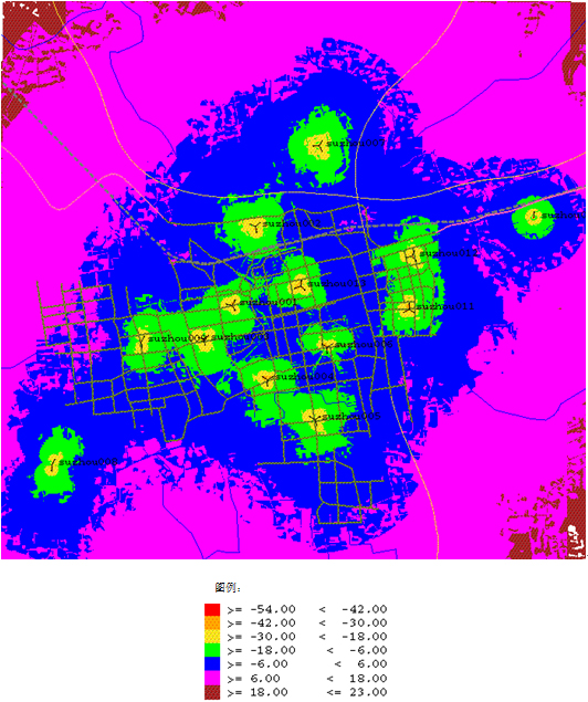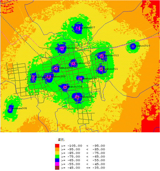 输入电子地图、基站信息,并选择一个合适的模型,就可以通过软件把离基站不同距离地方的接收功率等信息计算出来,并且显示在屏幕上。图3就是通过软件对某城市的覆盖进行了预测。图中不同颜色代表预测得到的不同接收功率,如图中绿色代表该区域接收机的接收功率在- 65dBm ~- 75dBm之间。